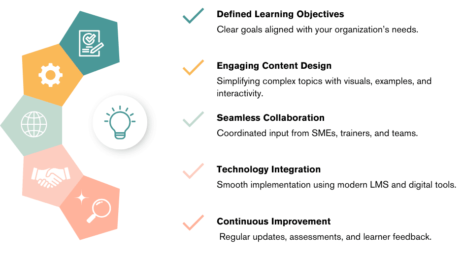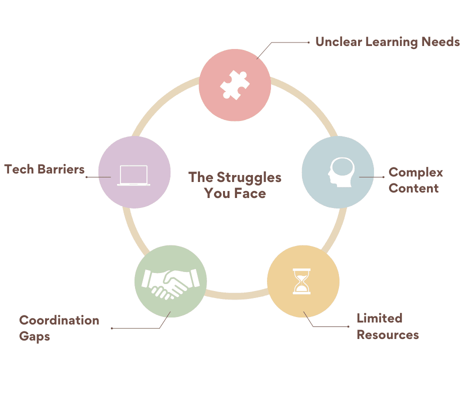Building effective training materials can be challenging. Many organizations struggle to identify true learning needs, balance technical content with clarity, and create materials that engage diverse audiences. Limited time, budget, and cross-department collaboration often add to the complexity. Without proper design and continuous improvement, training programs risk becoming outdated or ineffective.